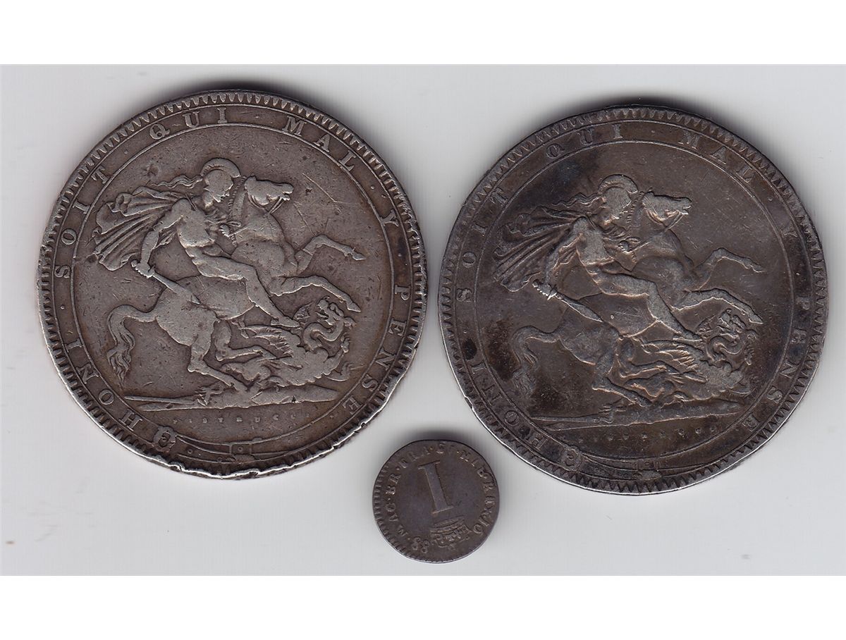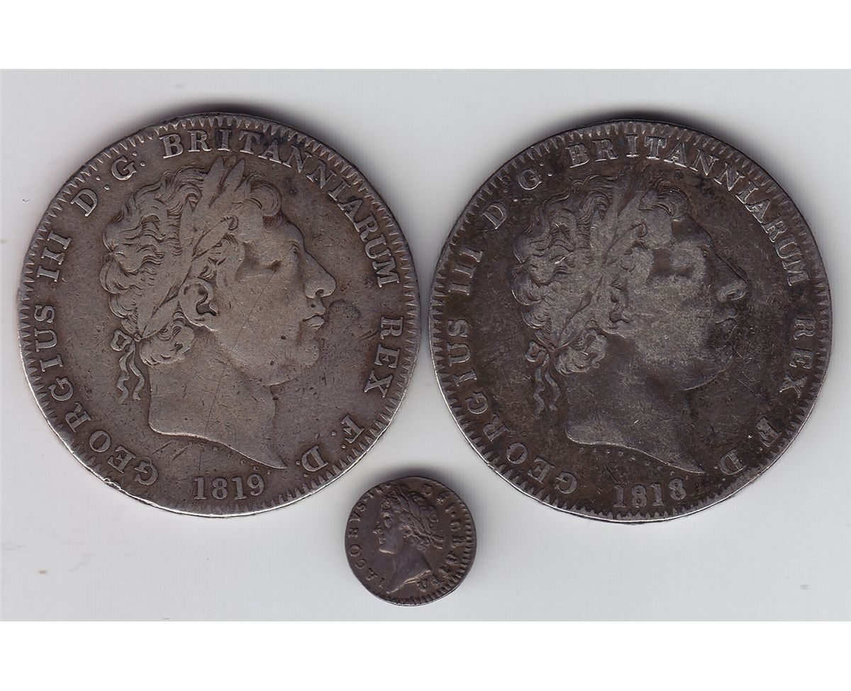 Includes: George III, Crown, 1818,KM 675, F-VF; George III, Crown, 1819, KM 675, F-VF with rim nicks; James II, Silver Penny, 1688, KM 449F. 3 Pcs.