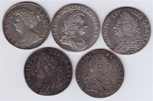 Includes: 1711 KM#533.2, F-VF; 1723 KM#558.1, VF; 1745 KM#583.2, VF; 1758 KM#583.3, aVF; 1787 KM#607.1, VF-XF. 5 Pcs.