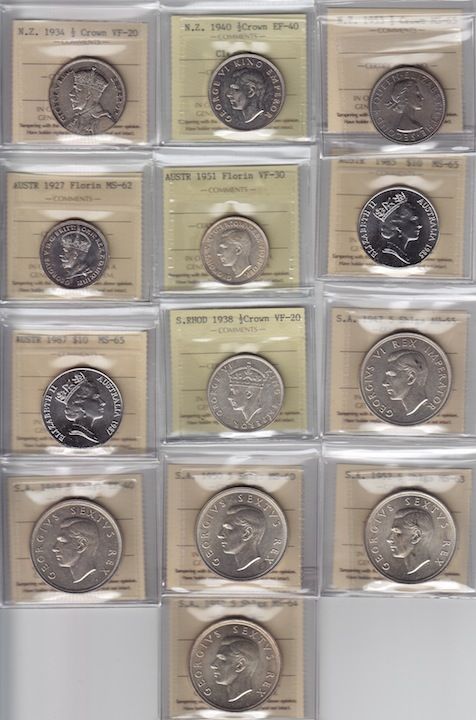 Includes: (10 are Silver): New Zealand Half Crown, 1934,KM 5, ICCS VF-20; New Zealand Half Crown, 1940, KM 14, , ICCS EF-40 (cleaned); New Zealand Half Crown, 1953,KM 29.1, ICCS MS-65, Low Mintage; Australia Florin, 1927m, KM 27, ICCS MS-62; Australia Florin, 1951m, KM 48, ICCS VF-30; Australia Ten Dollars, 1985, KM 84, ICCS MS-65; Australia Ten Dollars, 1987, KM 84, ICCS MS-65; Southern Rhodesia Half Crown, 1938, KM 15, ICCS VF-20; South Africa 5 Shillings, 1947,KM 31, ICCS AU-55; South Africa 5 Shillings, 1949, KM 31, ICCS EF-40; South Africa 5 Shillings, 1950, KM 31, ICCS MS-60; South Africa 5 Shillings, 1952, KM 41, ICCS MS-63; South Africa 5 Shillings, 1952, KM 41, ICCS MS-64. 13 Pcs.