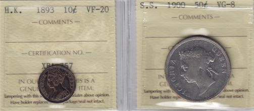Includes: Straits Settlements 1900 50 cents, KM#13, ICCS VG-8; Hong Kong 1893 10 cents, KM#6.3, ICCS VF-20. 2 Pcs.