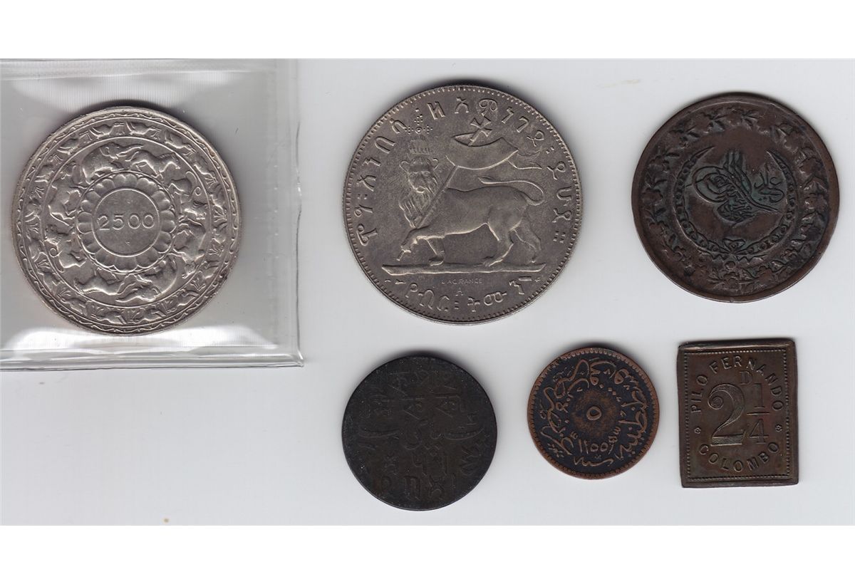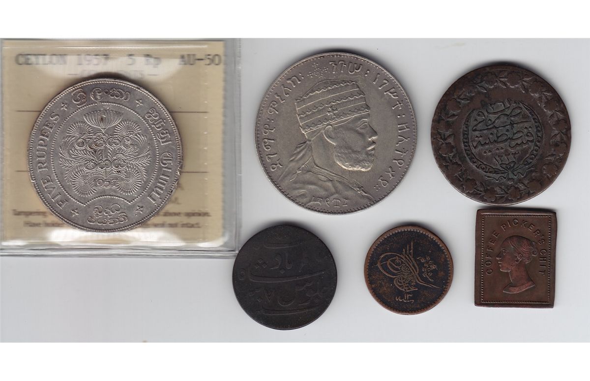 Includes: 1957 Ceylon, Buddha Jayanthi 2500th Anniversary 5 Rupees, KM 126, ICCS AU-50; Ceylon Coffee Picker's Chit, XF; Ethiopia King Menelik II 1/8 Birr, KM 2; AH1255/13, Egypt 5 Para (1850), KM 224.2, VF-XF; India (Bengal), 1 Pice, 1816, KM 27.1; 1223/26, Turkey 5 Kurush 1833, KM 599, F. 6 Pcs.