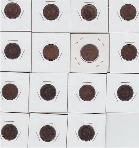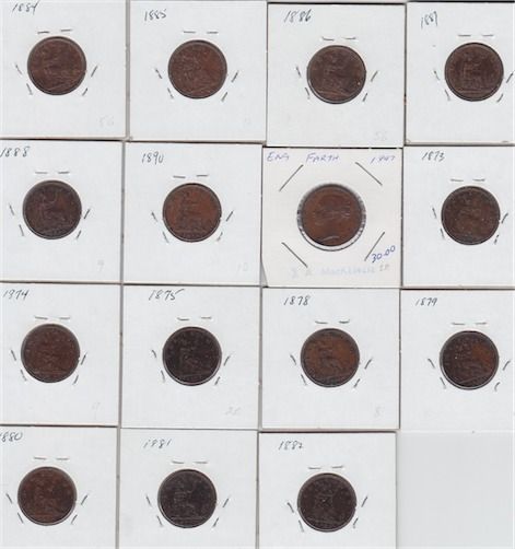 Includes: 15 British Farthings dating from 1847 to 1890 varying in condition from Fine to Uncirculated. 15 Pcs.