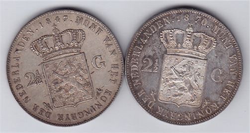 2 1/2 Gulden, 1847, 1870. XF-AU. 2 Pcs.