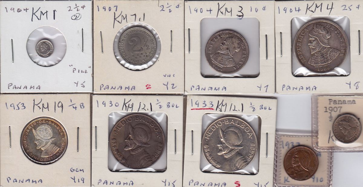 Includes: 1/2, 1, 2 1/2 (x2), 10, 25 Centesimos; 1/4, 1/2 (x2) Bolboa. Conditions range from XF-AU. 9 Pcs.