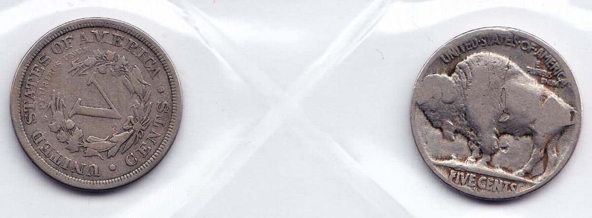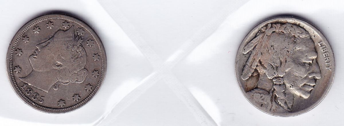 Includes: 1885 Liberty "V" Nickel - Key Date, about VF; 1921 S USA Buffalo Nickel - VG/Fine. 2 Pcs.