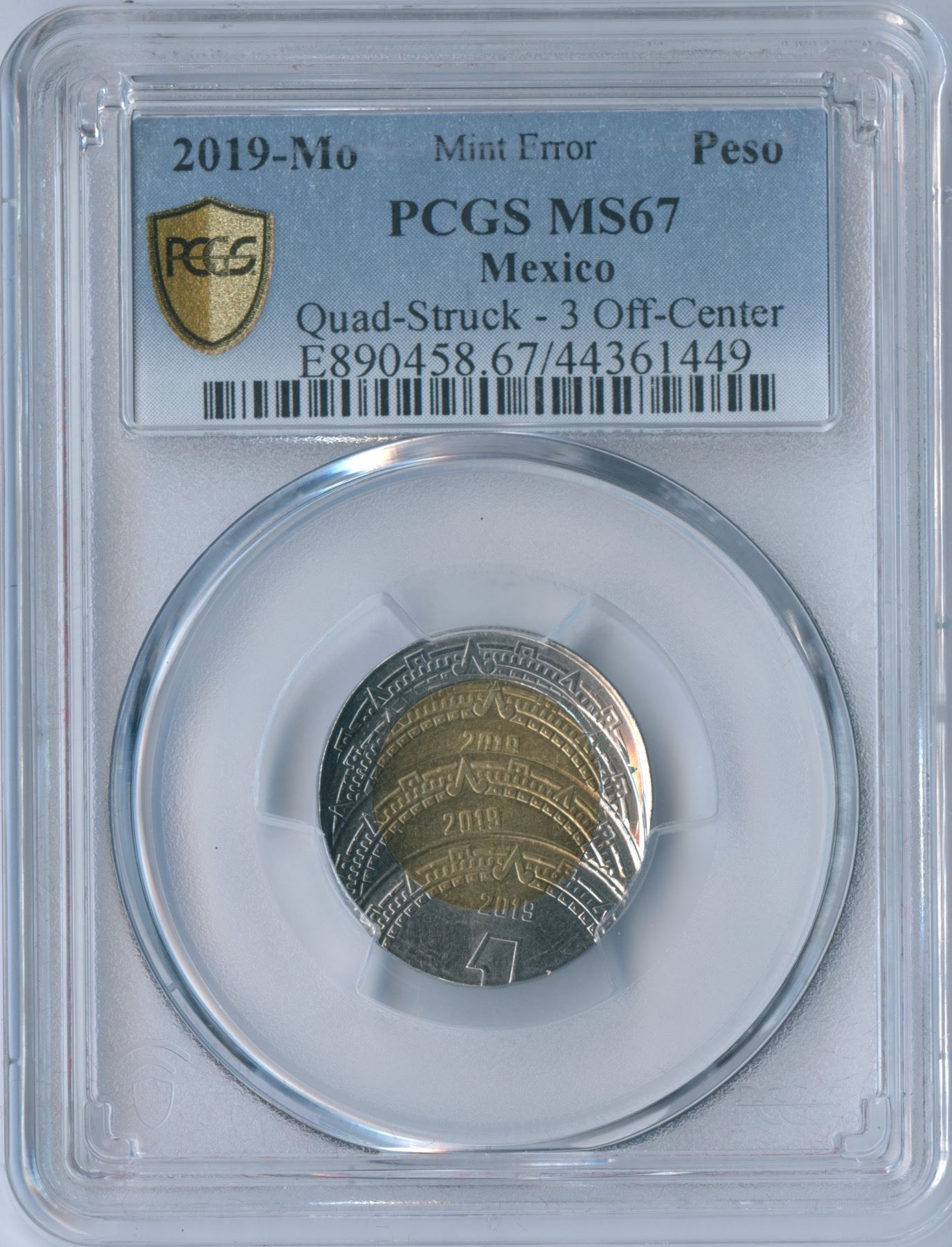 Mexico 2019 1 Peso, struck four times, with three off-centre strikes, 25%, 50%, 75% progressively off-centre. A beautiful and eye-appealing error, in a gem grade, PCGS MS-67.