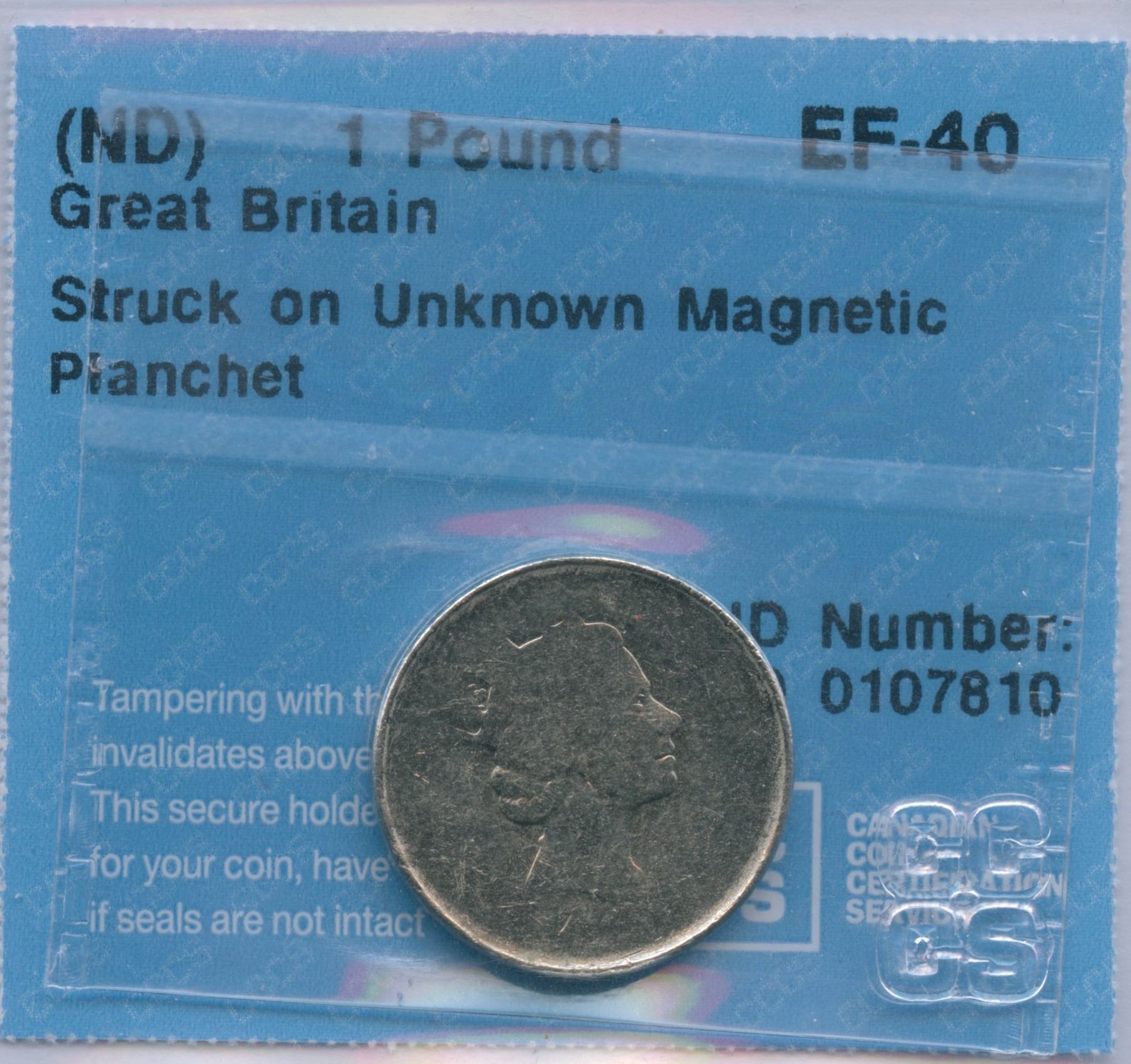 Great Britain, 1 pound, struck on a nickel-plated steel planchet from an unknown host country. Very weakly struck due to a much thinner planchet, CCCS EF-40.