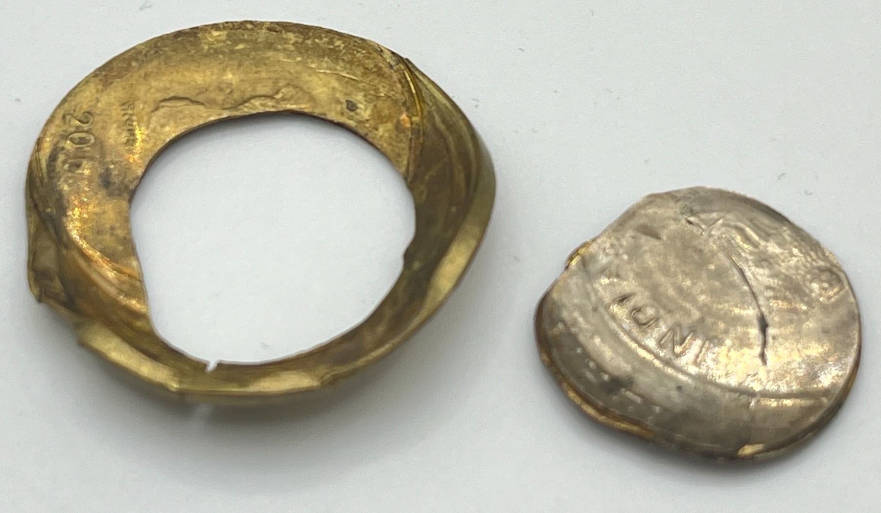 World Errors - India - India 10 Rupee error coins. The coin has been struck a minimum of six times (or more) over a capped anvil die, with a uniface reverse. The core has separated from the ring due to the intense deformation of being struck over a capped die, that likely had several coins bonded to it. A wildly appealing error