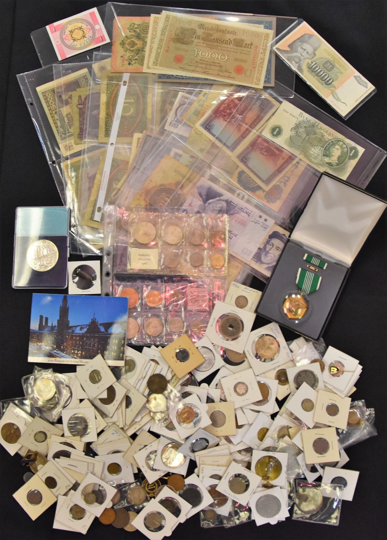 Includes paper money and coins. Nice large lot worth viewing.