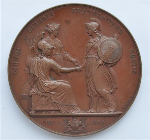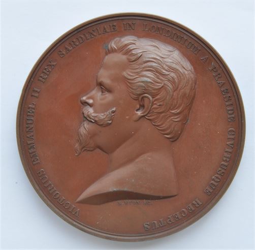 Great Britain 1855 Visit of Victor Emmanuel II City of London series medal by B Wyon - AE, Obv. Britannia with Londinia at her side. 76mm, part of the celebrated City of London series of medals. This has a low mintage of 350 examples. AU/Unc.