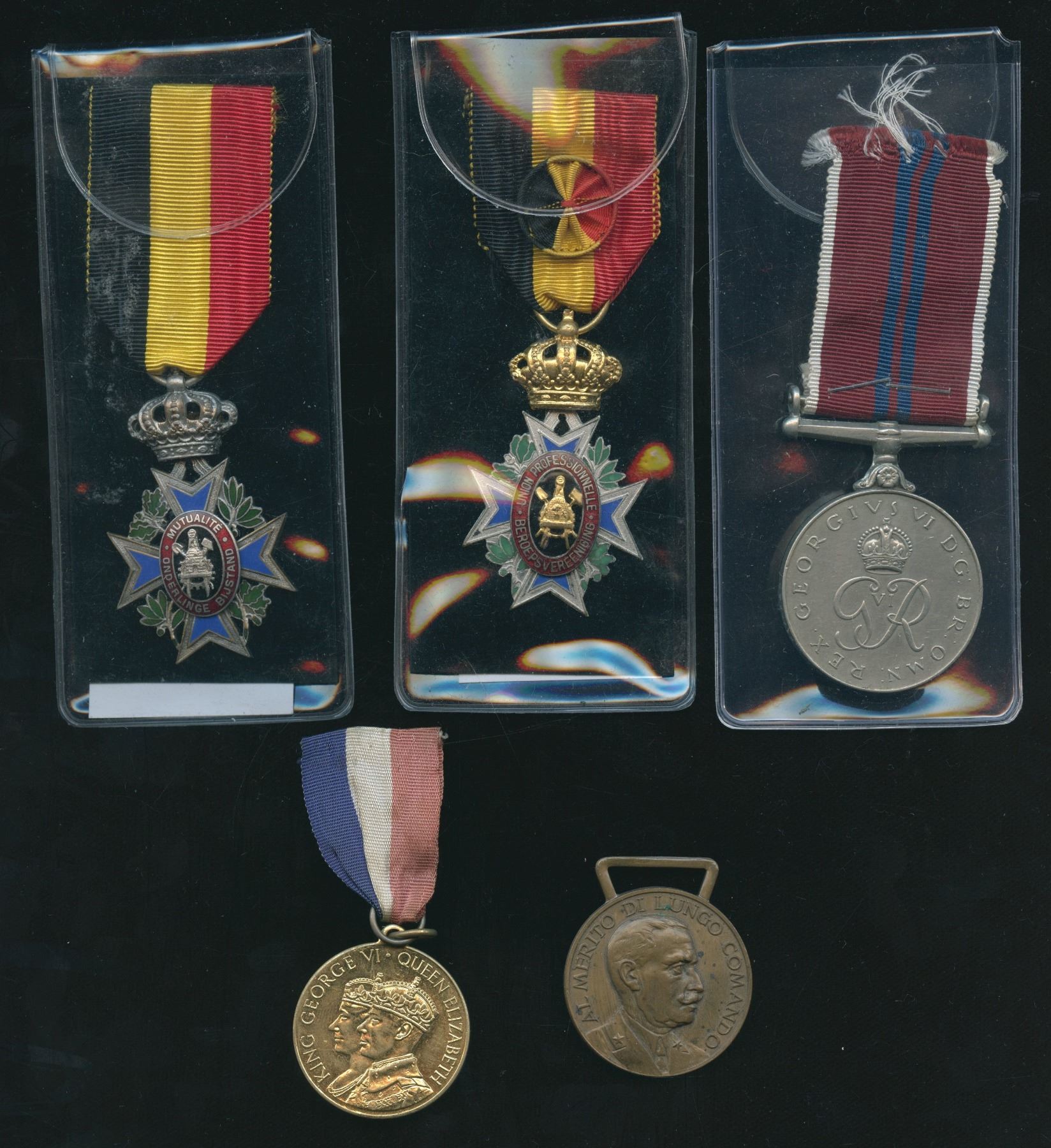 Includes: 1937 King George VI / Queen Elizabeth Coronation Medal, Pakistan Independence medal, Italy Military Service medal & two Belgian Labour medals. 5 pcs.