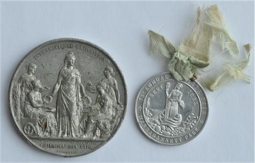 USA - Lot of Two: International Exhibition Philadelphia 1876. WM 54mm, a few bumps VF+; Rhode Island State Fair 1893 Narragansett Park WM 33mm, EF tattered original ribbon attached. 2 Pcs.