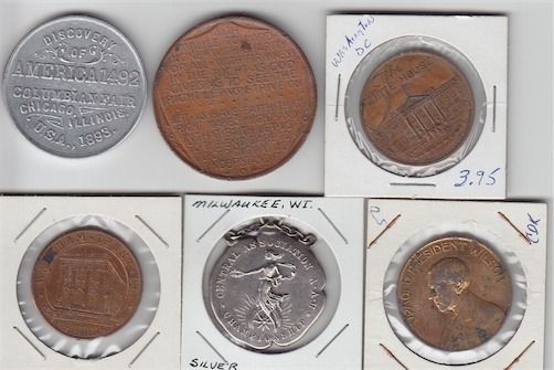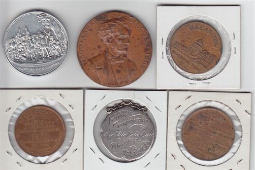 Lot of six: Abraham Lincoln, 1809 - 1865, H. Zearing, Bust of Lincoln, REV 2 of Lincoln's quotes, copper, 45 mm, Obv. has staining; President Wilson, his bust, Rev. Have given $1.00 to the Pennsyvania Democratic American Fund, 1914, brass; Obv. the White House, Rev. US Capitol, bronze; Discovery of America 1492, Columbian Fair, Chicago, Illinois, USA 1892, AL, 40 mm; Watham Trust Co., GF 50 cents on $5.00 deposit; Centennial Association AAU Championship, Awarded to Indoor Championship, One Mile Relay Run, Milwaukee, Mar 7, '03, silver. 6 Pcs.