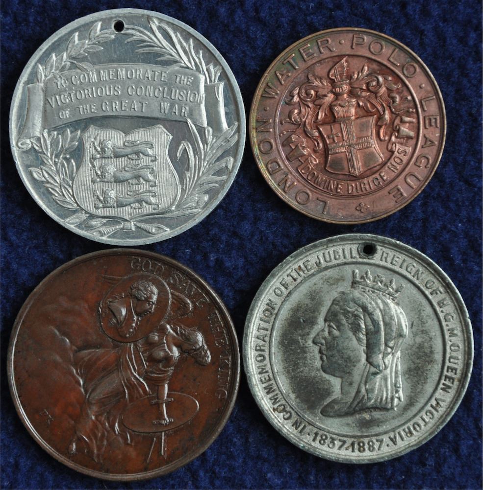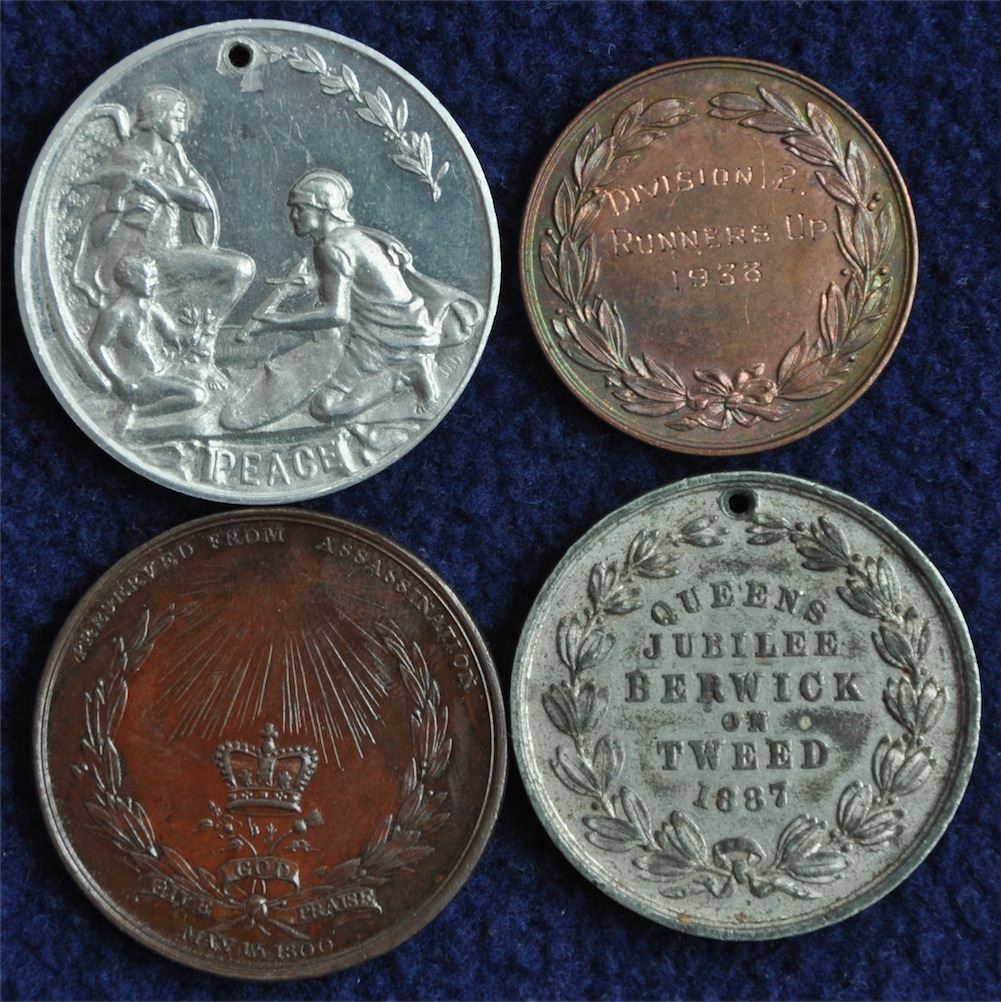 1800 George II "Preserved from Assassination", AU, British, conclusion of the Great War peace aluminum medal, British, UNC; 1897 Queen Victoria's Jubilee, Berwick on Tweed, WM, Fine; London Water Polo League, copper, Division 2 Runner-Up, 1938, AU. 4 Pcs.