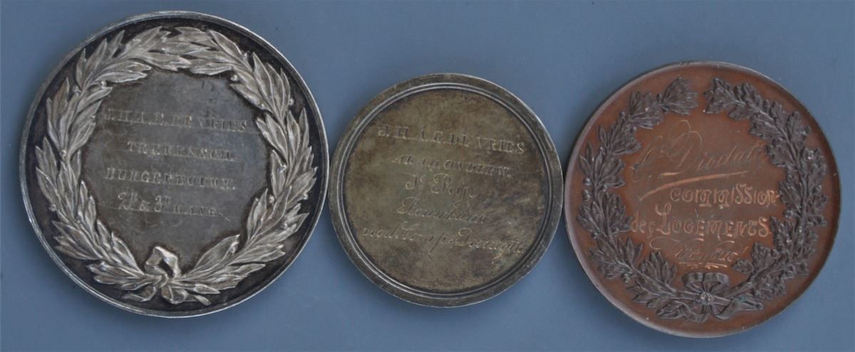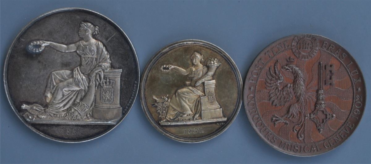 2 medals from the Netherlands in silver by Van Derkellen. 38mm, 50mm, Silver, both awarded to J.H.A.E. De Vries, 1854-1855; and interesting 46mm, Copper. Switzerland music festival piece awarded in 1902. Viewing recommended. 3 Pcs.