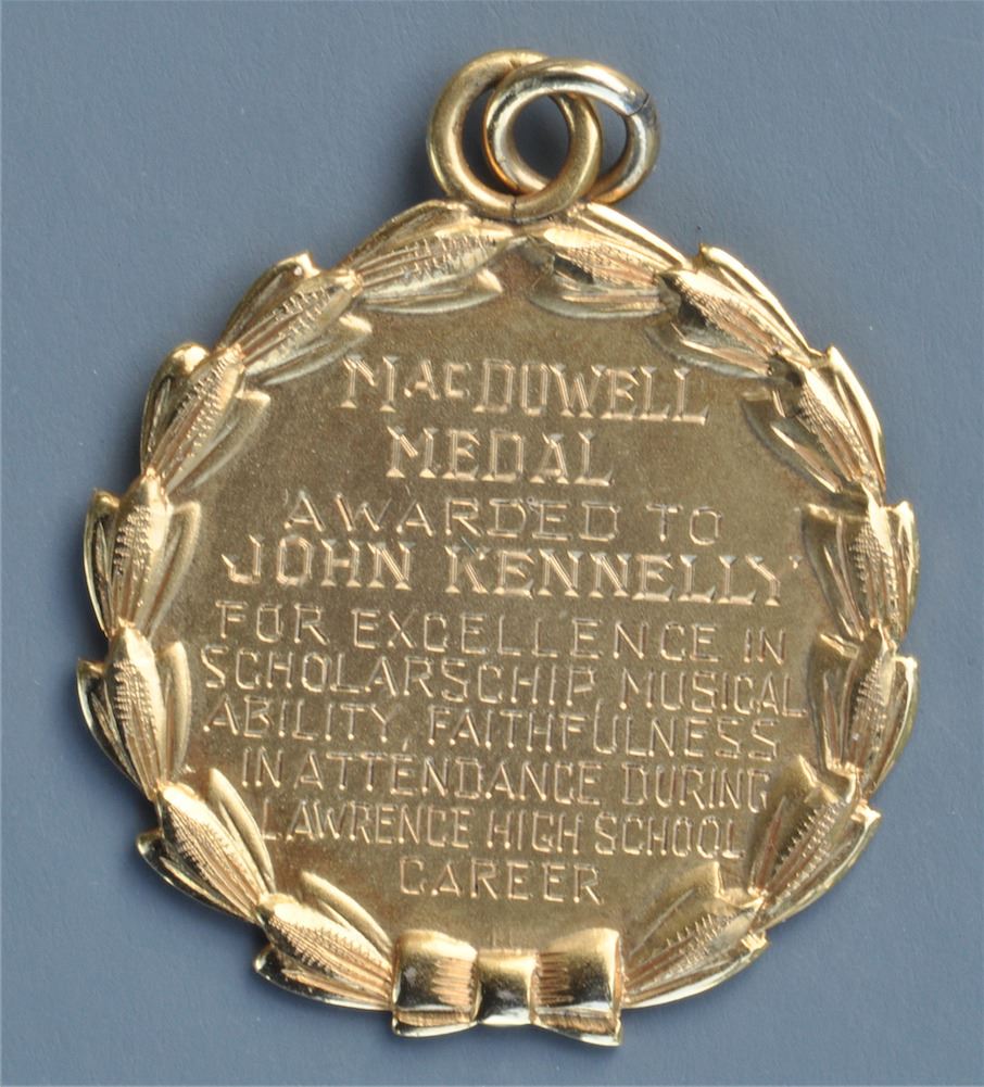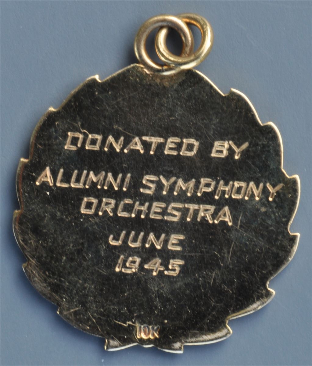 Lawrence High School, awarded to John Kennelly, donated by Alumni Symphony Orchestra, 1945, 10 kt gold, 4.1 gms (Thought to be United States, possibly Massachusetts).