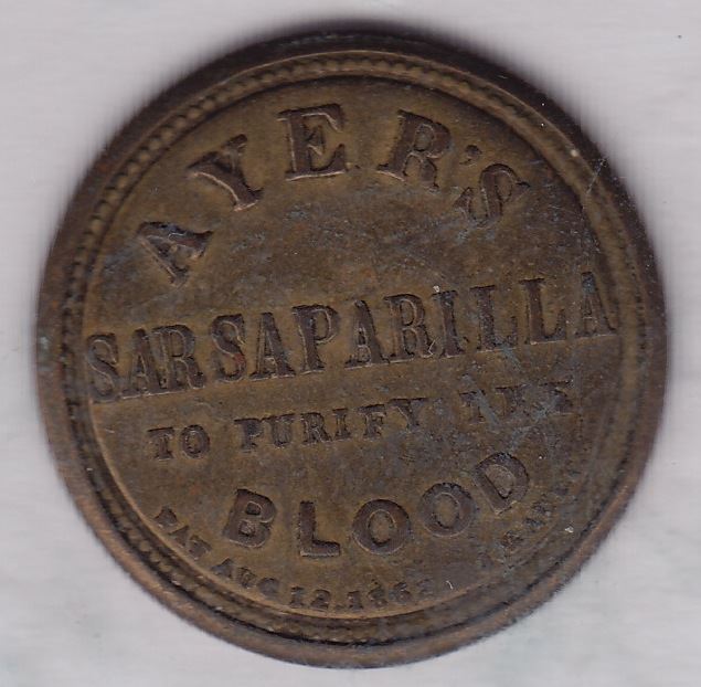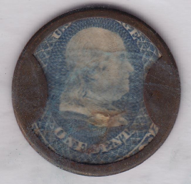 1862 Ayer's Encased Postage Stamp One cent Franklin's Ayer's Sarsaparilla encased postage, Scott EP-13, 1862, 25 mm, VF, mica intact, brass, stamp blue paper , used originally as a result of a coin shortage but later as advertising for J.C. Ayer, 101+ known but scarce nevertheless.