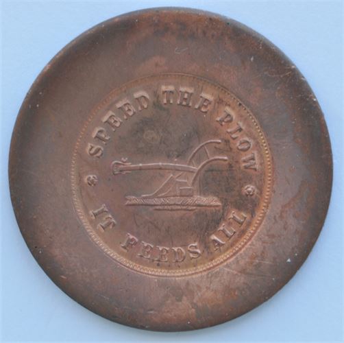 Thomas Elder Token New York coin dealer issued a series of tokens about 1908 featuring a close copy of the Canadian Bouquet Sou Br.690 and using 4 different reverses. He attended the 1909 ANA convention in Montreal and brought these specimens and handed them out to collector friends. The dies apparently were not destroyed and modern pieces were made using large planchets. These planchets were 45 mm in diameter and this specimen is copper. They are uniface and Unc. They were produced sometime in the 1950’s or 60’s.