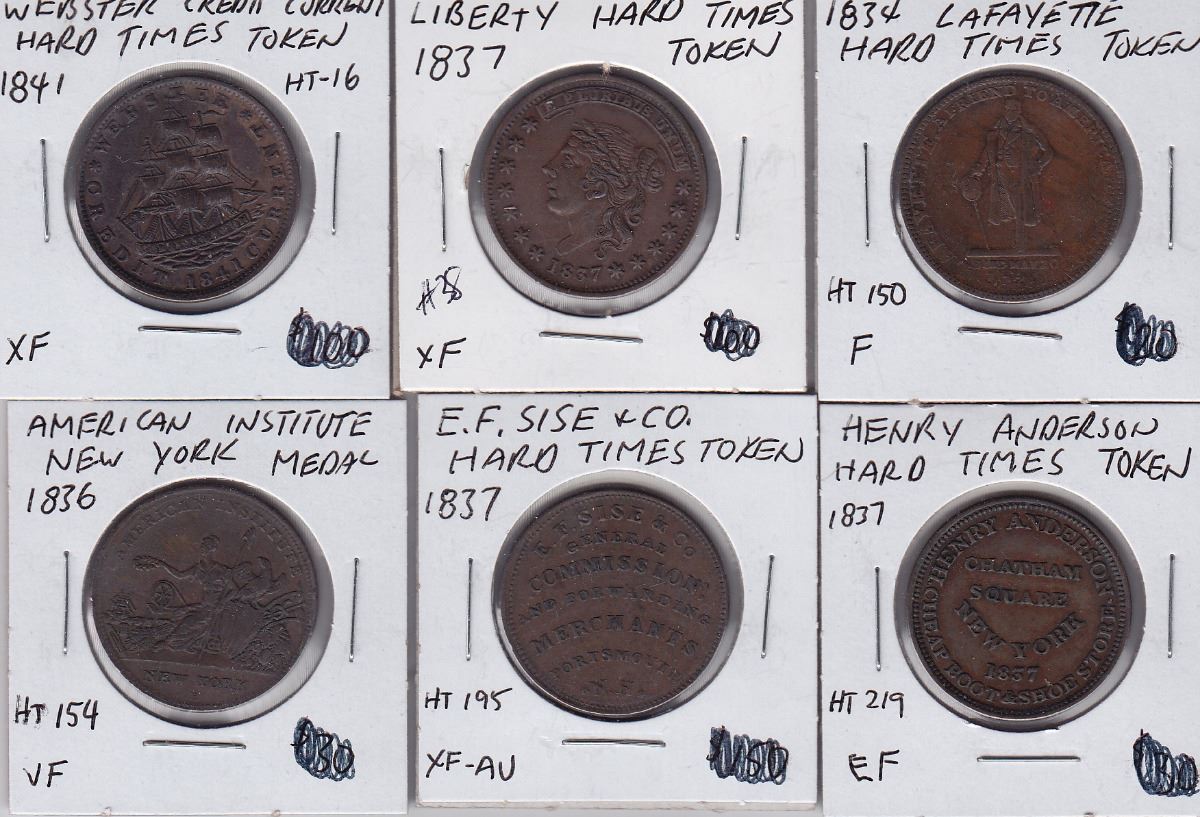 Hard Times United States tokens, Rulau numbers, HT-16 EF+; HT-38 EF; HT-150 F; HT-154 VF; HT-195 EF; HT-219 EF. 6 Pcs.