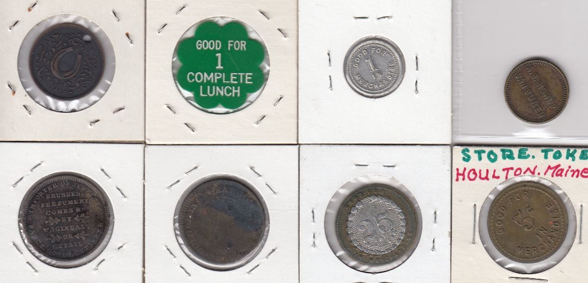 World Tokens - 8 trade tokens from America, Alfred Willard, Boston; Robert Bruggles, New York; S.D. Childs & Co., Chicago; Fox Brothers, Houlton, Maine; A.B. Bishop, VanBuren, Maine; Barone's Grill, Lackawanna, New Y ork; Harvey High School, Painesville, Ohio; White Brothers, Boston, MA. 8 Pcs.
