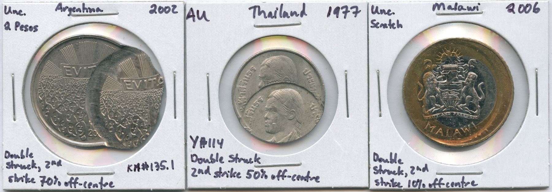 Lot of 3 double struck world errors. These coins are visually eye-catching, and double strikes like these usually command fairly strong prices. Must be seen to be appreciated. Patrick Glassford Collection.
