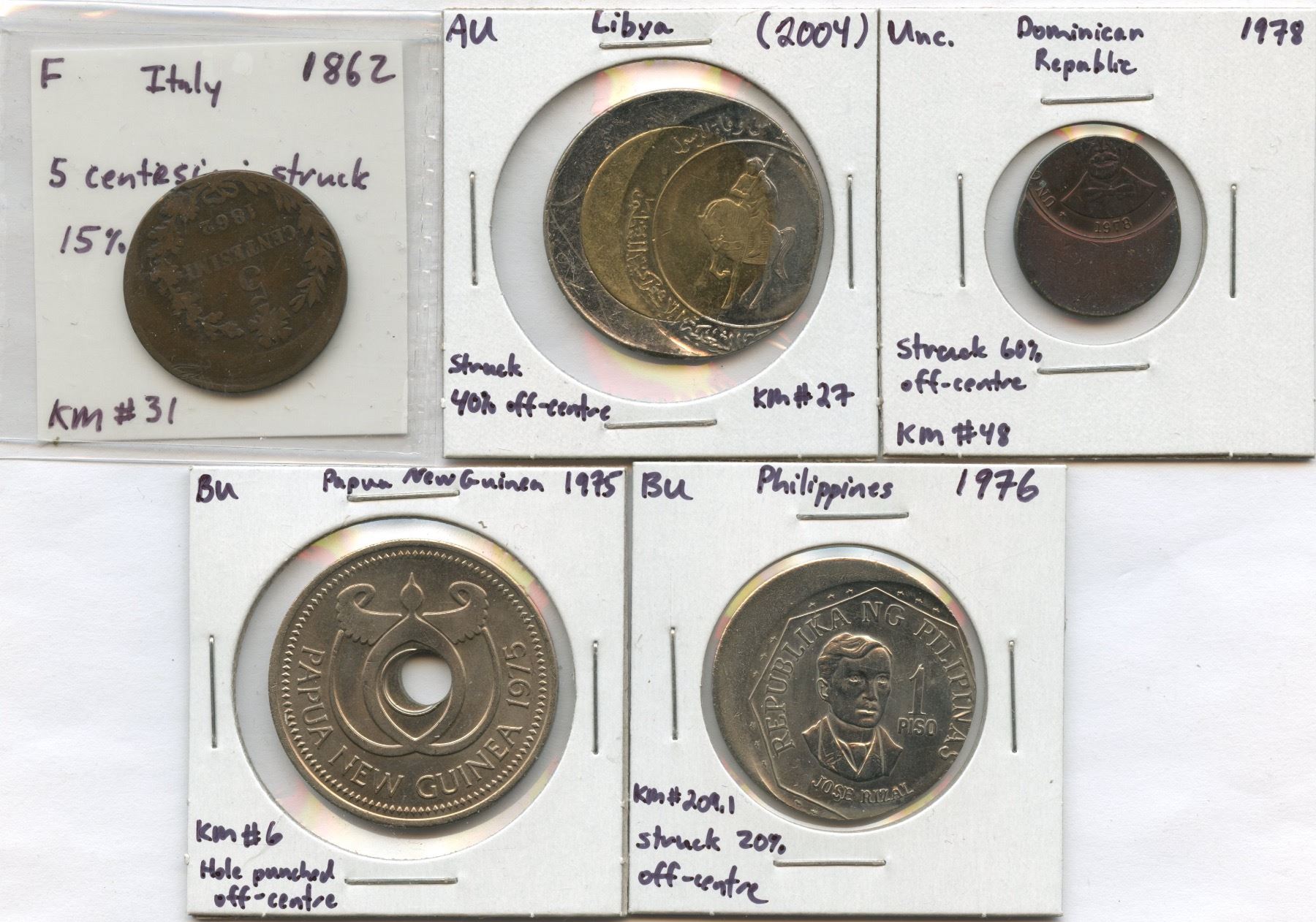 Lot of 5 world errors all struck significantly off-centre, or have a planchet punching feature off-centre. A nice collections of really cool and eye-appealing errors. Patrick Glassford Collection.