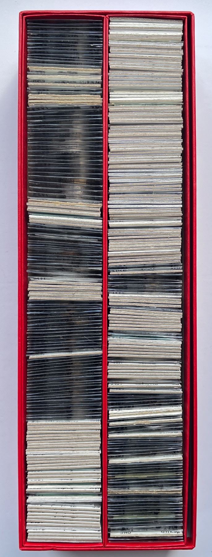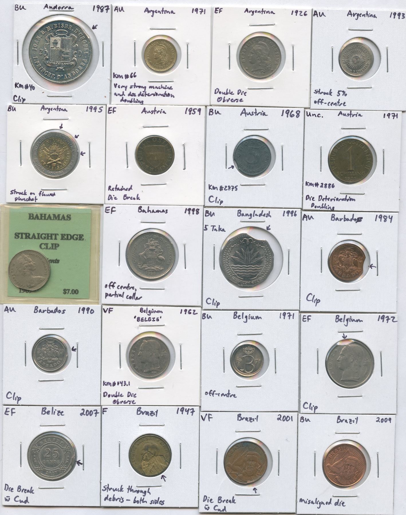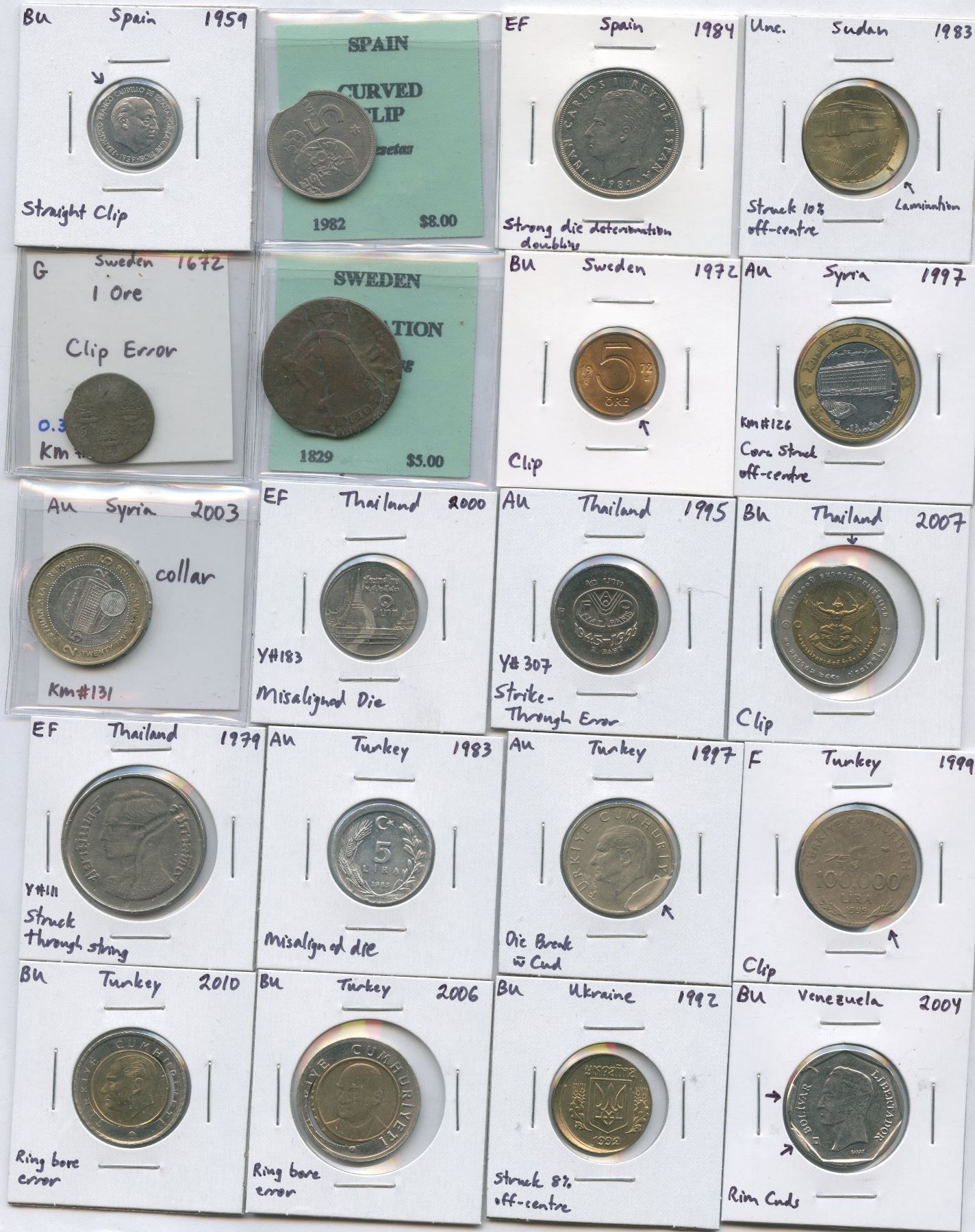 Full double row box of mixed world errors, from the 1600s to modern dates. A full range of error types are in here, including laminations, strike-throughs, cuds, clips, off-centres, broadstrikes, indent strikes, partial brockages, etc. Some errors are significant. Arranged in order from A to Z, a great bulk lot for dealer inventory. Patrick Glassford Collection.