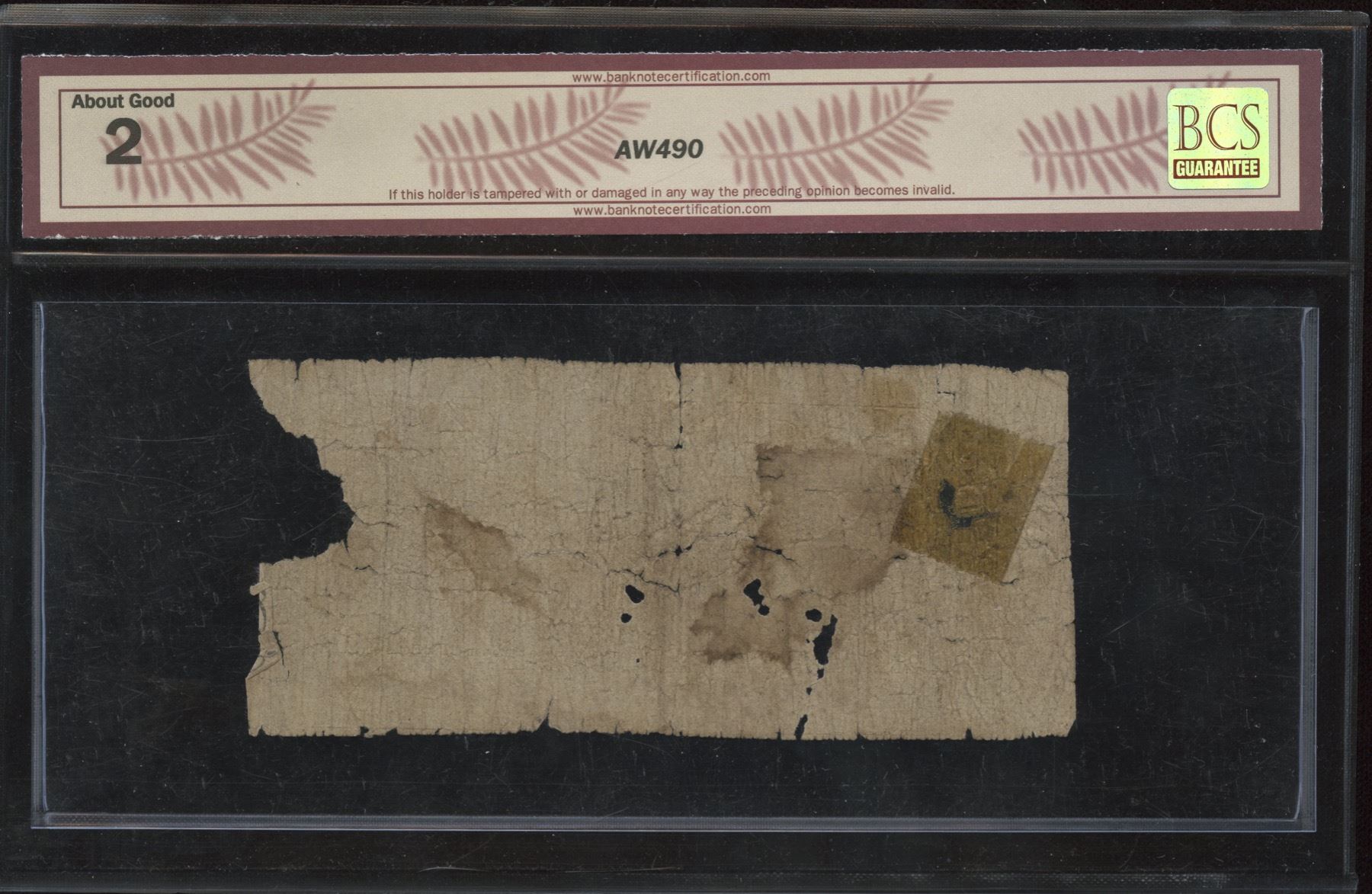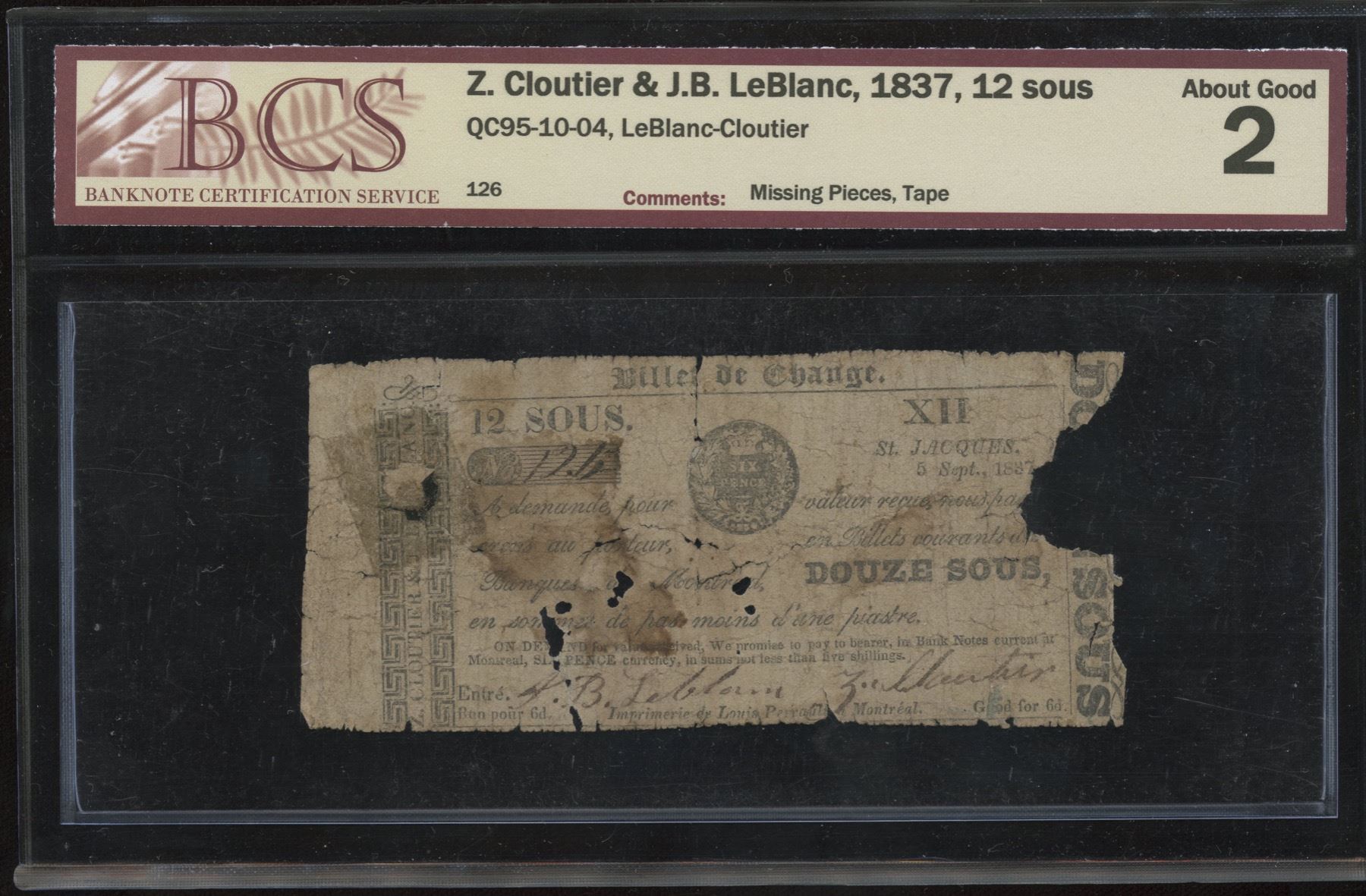 QC95-10-04. BCS About Good, missing pieces, tape. 12 Sous, 1837. S/N: 126.
