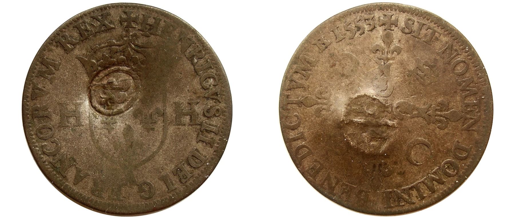 1640 countermark on a 1553-A [Paris Mint] Henri II Douzain aux Deux H, Ciani 1312, Duplessy 999, Som